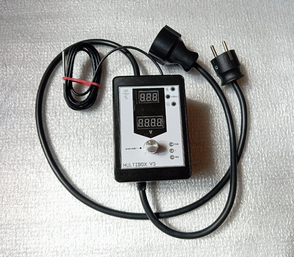 • терморегулятор, який керує або регулятором потужності: підтримка температури між двома встановленими значеннями або зміна потужності при досягненні температури (діапазон 5.0-125°С, точність 0.1 °С, герметичний датчик 6 мм з дротом 2м)
