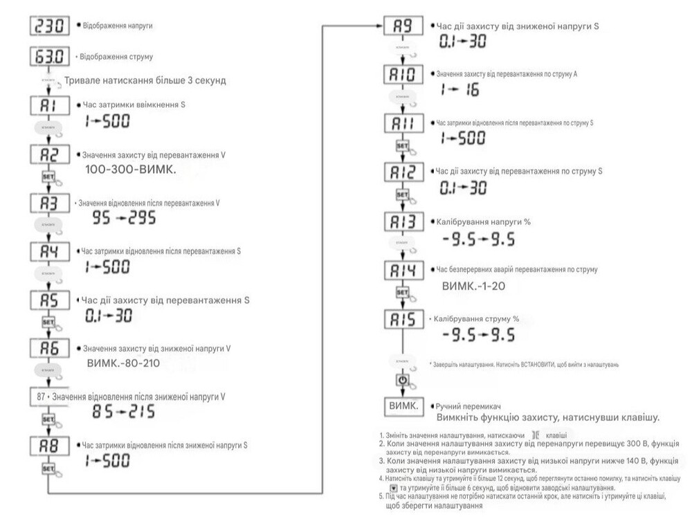 * Затримка відновлення після перенапруги: 1-500 с (заводська установка: 30 с)
